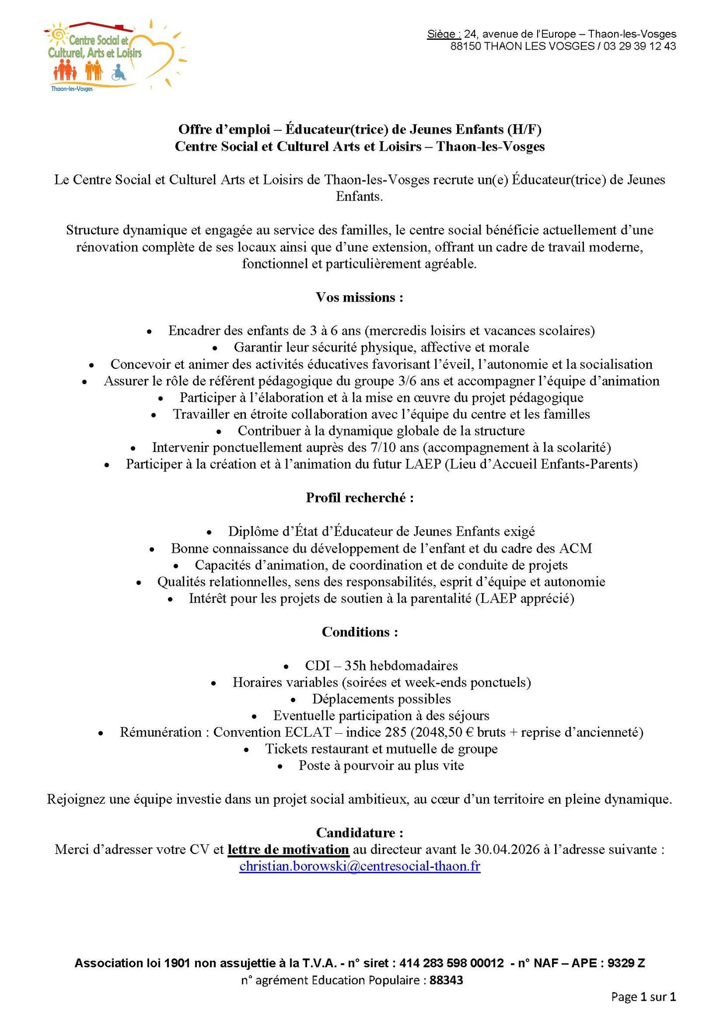 Rejoindre le centre social de Thaon-les-Vosges, c’est intégrer une équipe investie, engagée au quotidien auprès des habitants, et participer activement à des projets porteurs de sens au cœur du territoire.